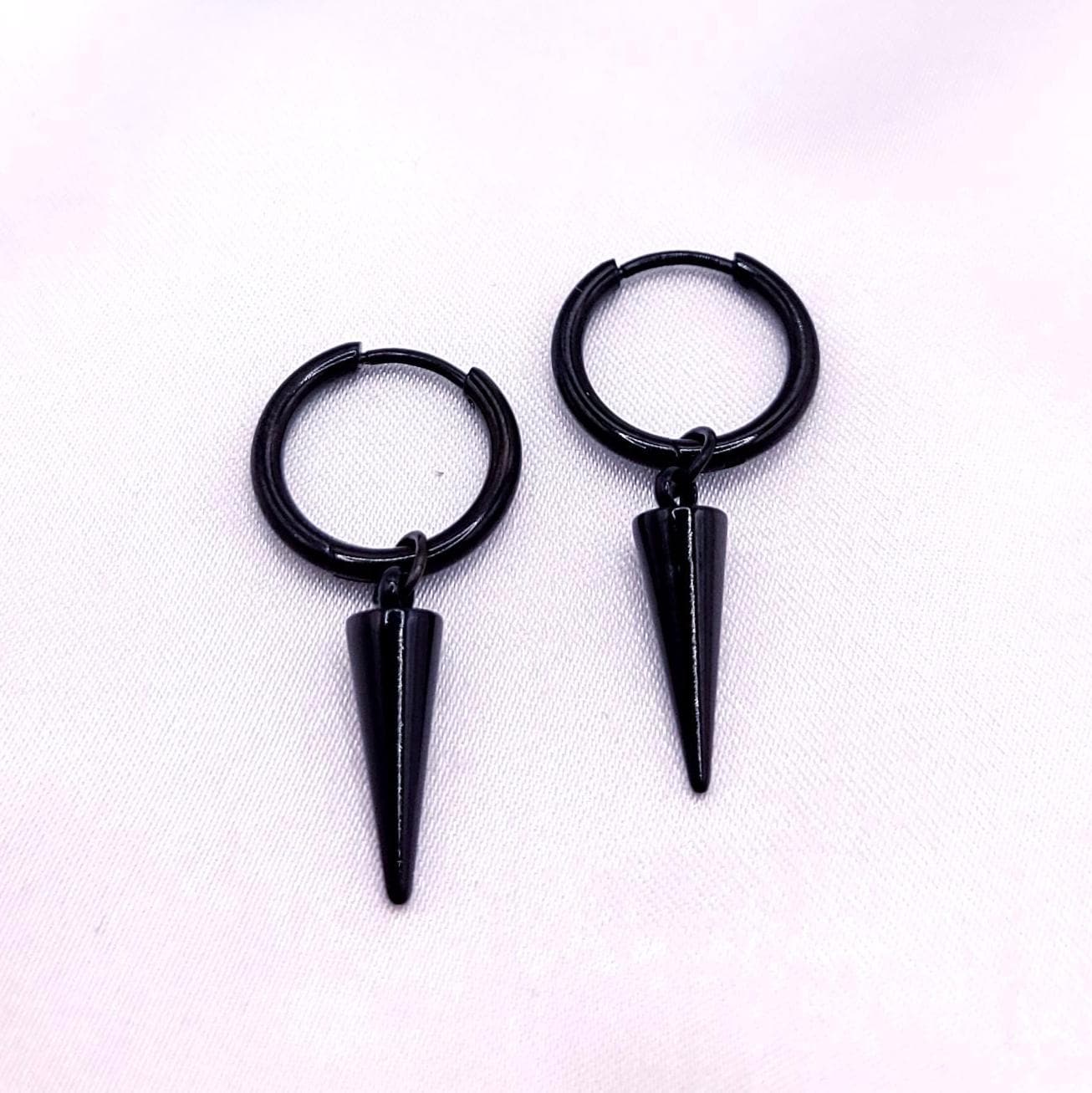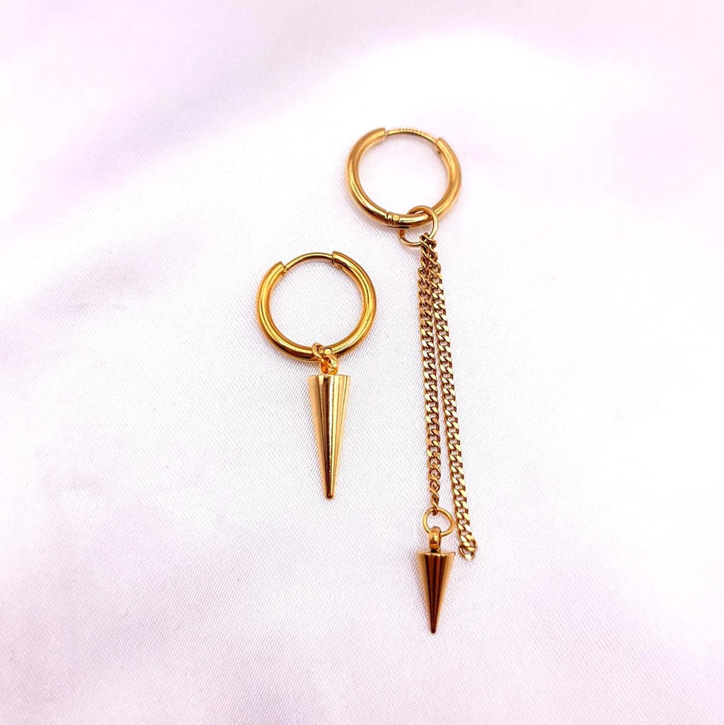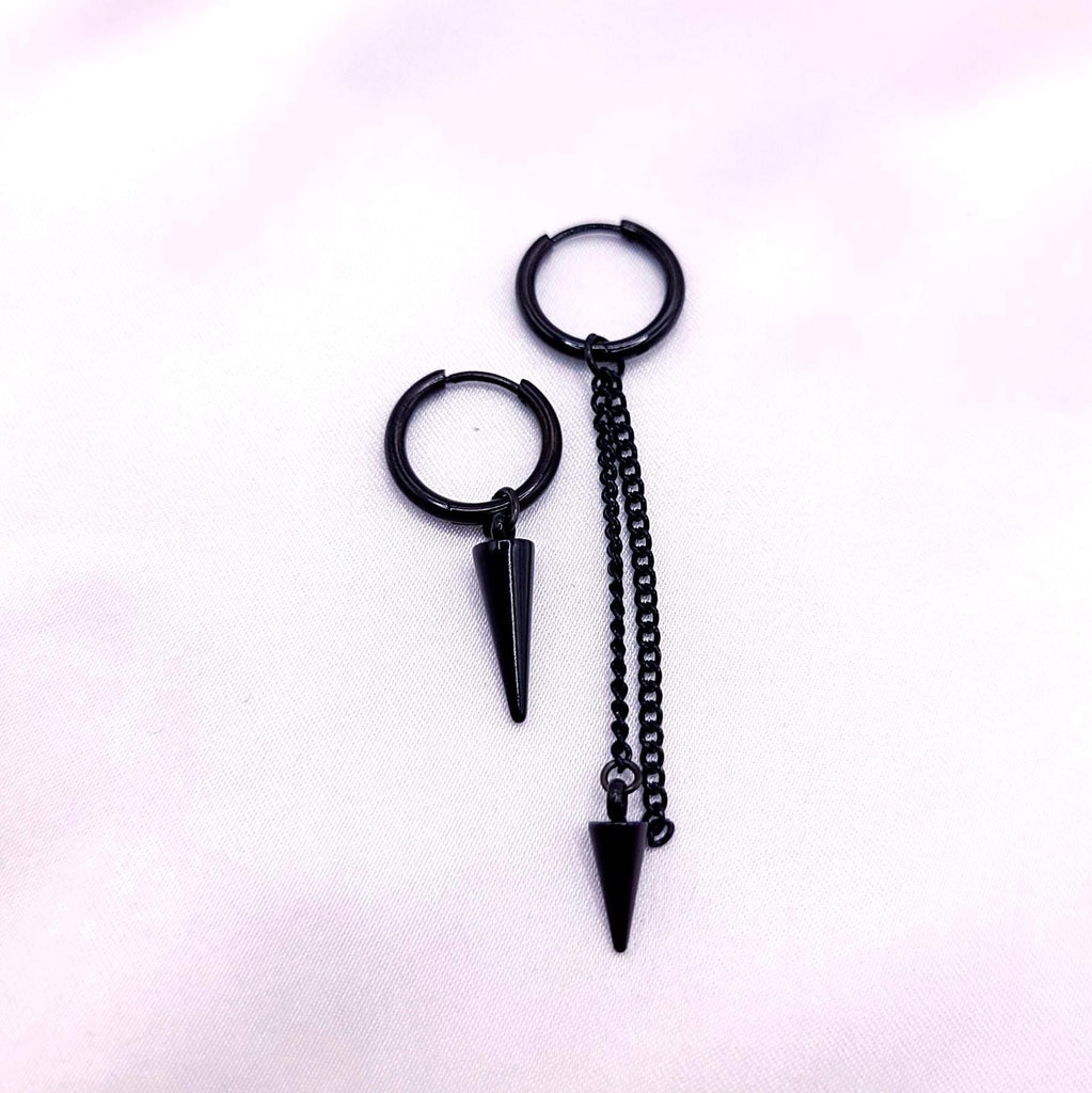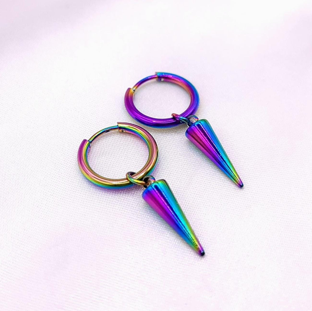 All components are stainless steel based and nickel free. Black is electroplated, Gold is 18k gold plated, Rainbow is ion plated, and silver is grade 304 stainless steel. Spike earrings are just under 1.5 inches long. The long chain earring measures just over 2.5 inches long. All items come from a smoke free, kitty friendly home ♥