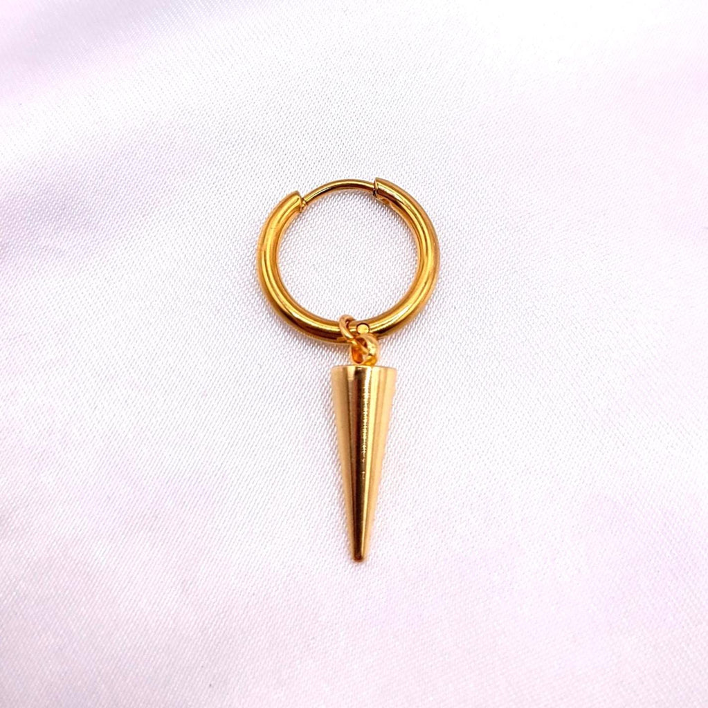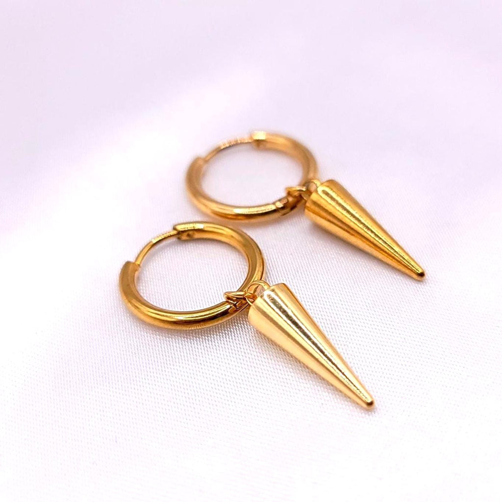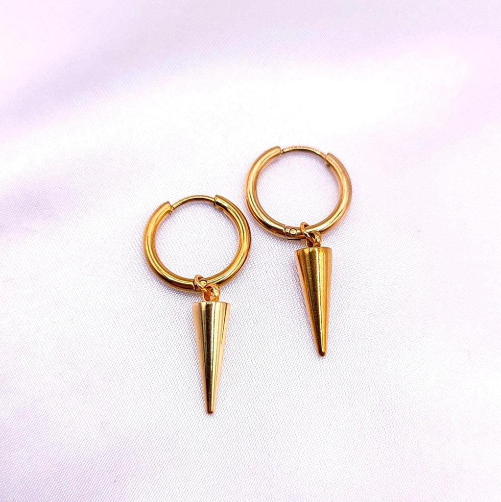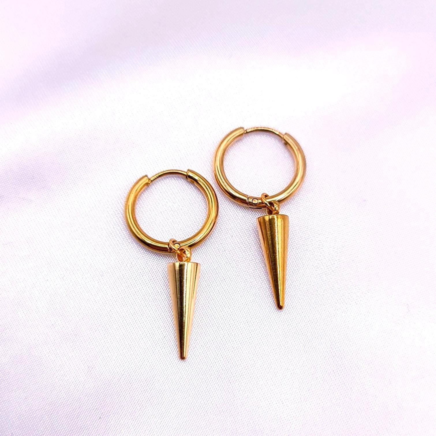 All components are stainless steel based and nickel free. Black is electroplated, Gold is 18k gold plated, Rainbow is ion plated, and silver is grade 304 stainless steel. Spike earrings are just under 1.5 inches long. The long chain earring measures just over 2.5 inches long. All items come from a smoke free, kitty friendly home ♥