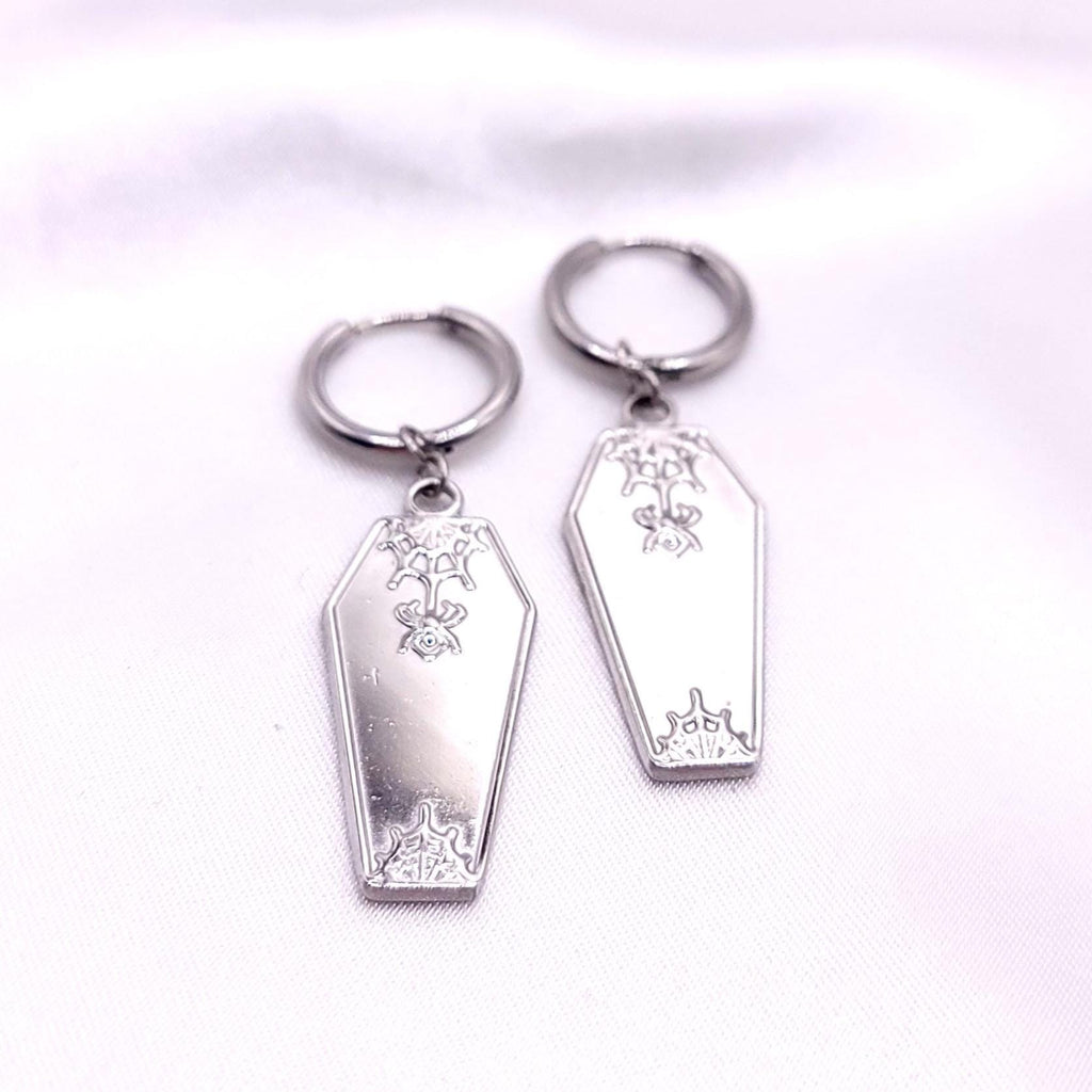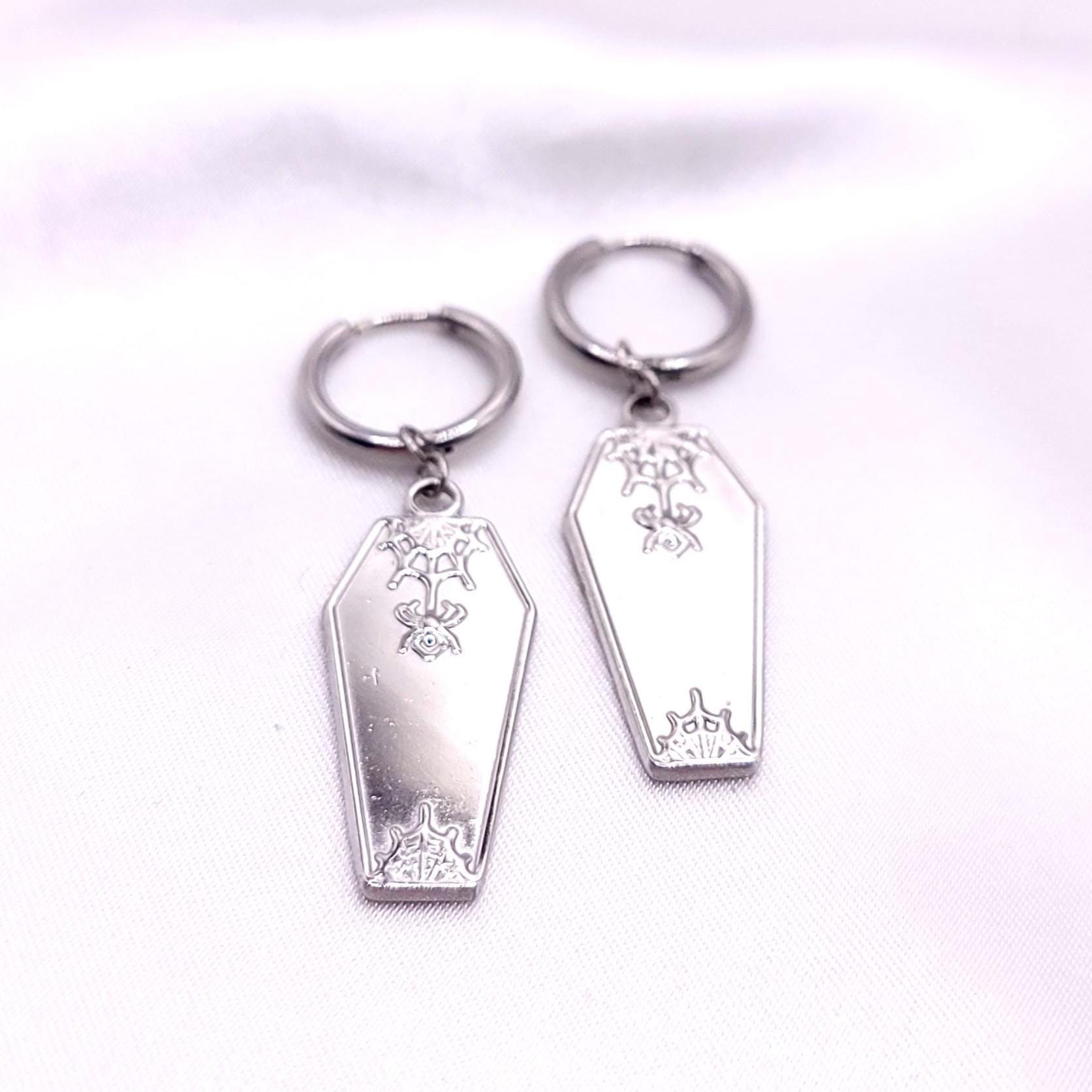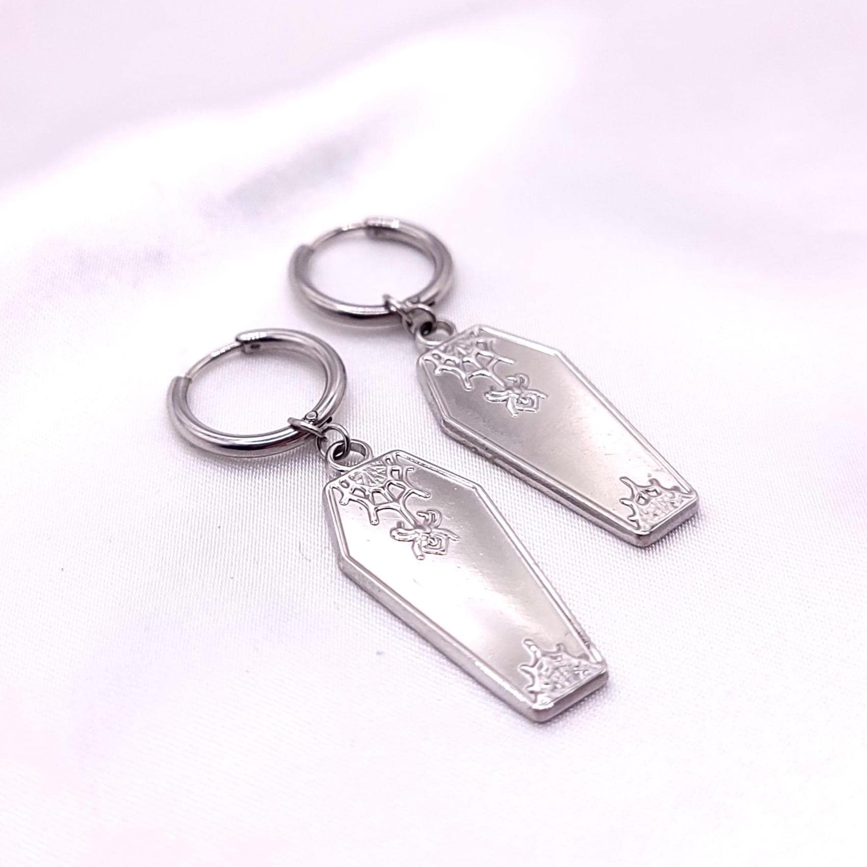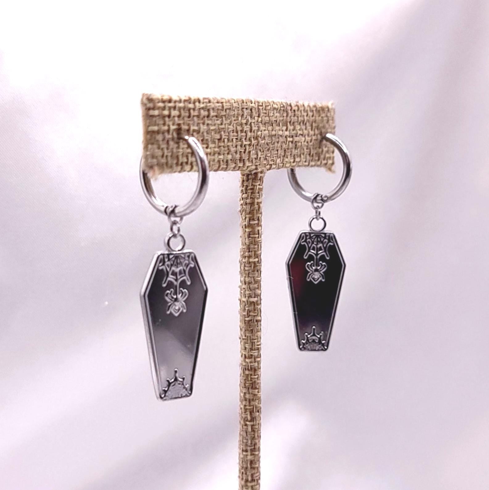 Stainless steel coffins hand from stainless steel hoops. The coffin piece measures about 1.25 inches long with the entire earring coming in just under 2 inches long.