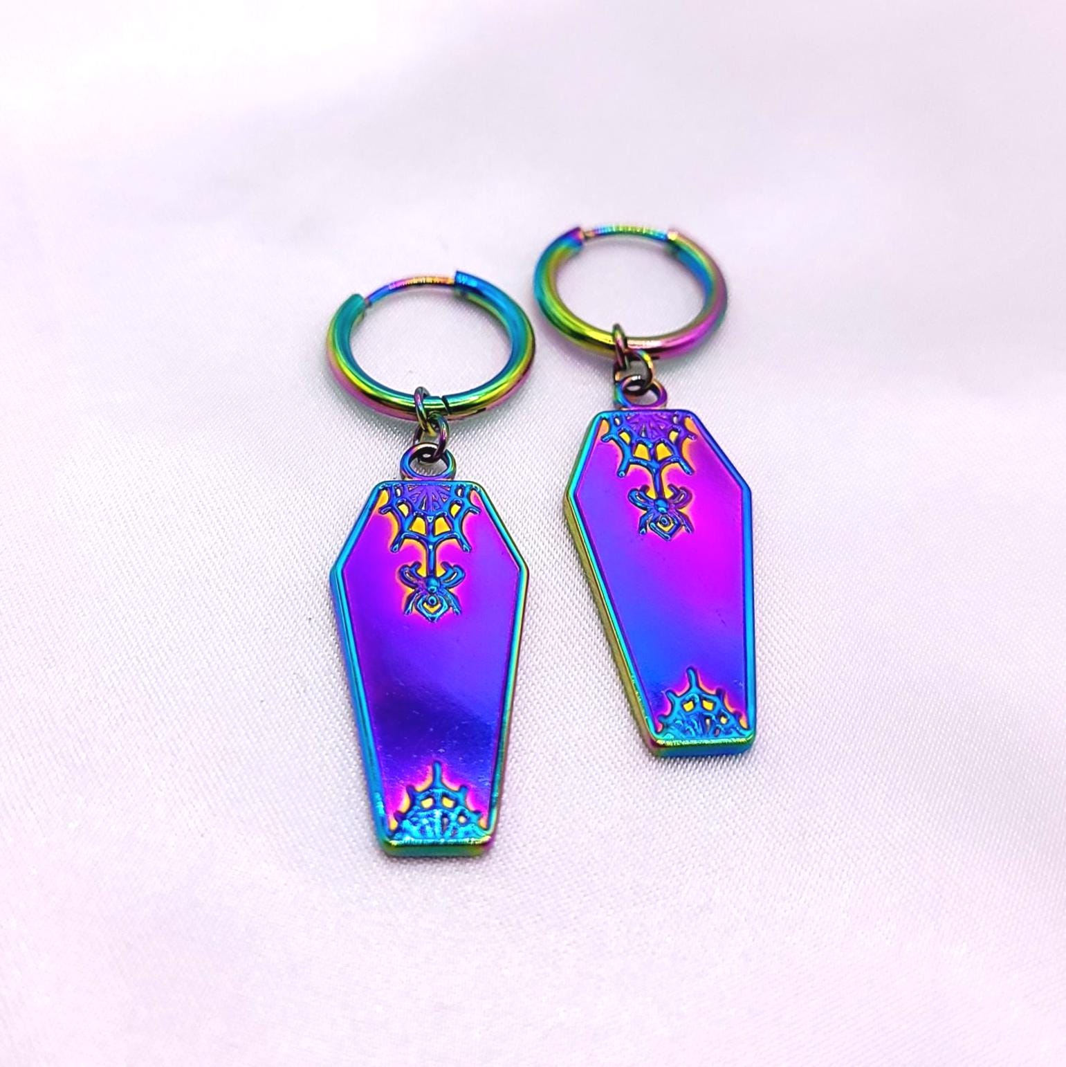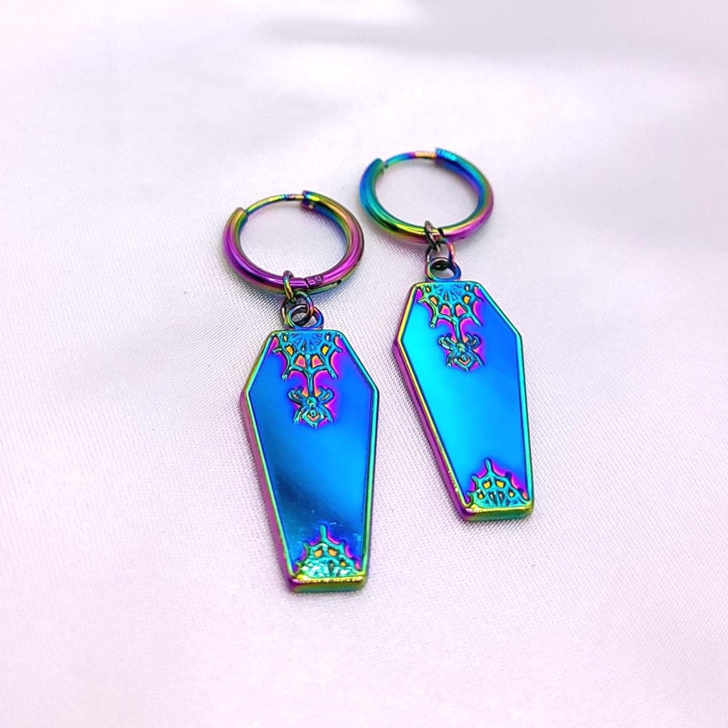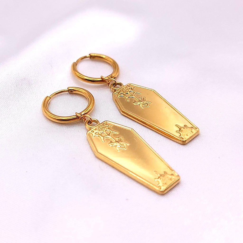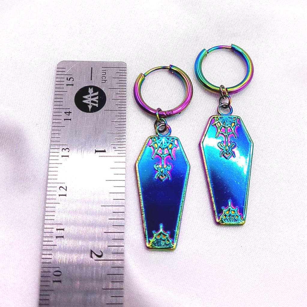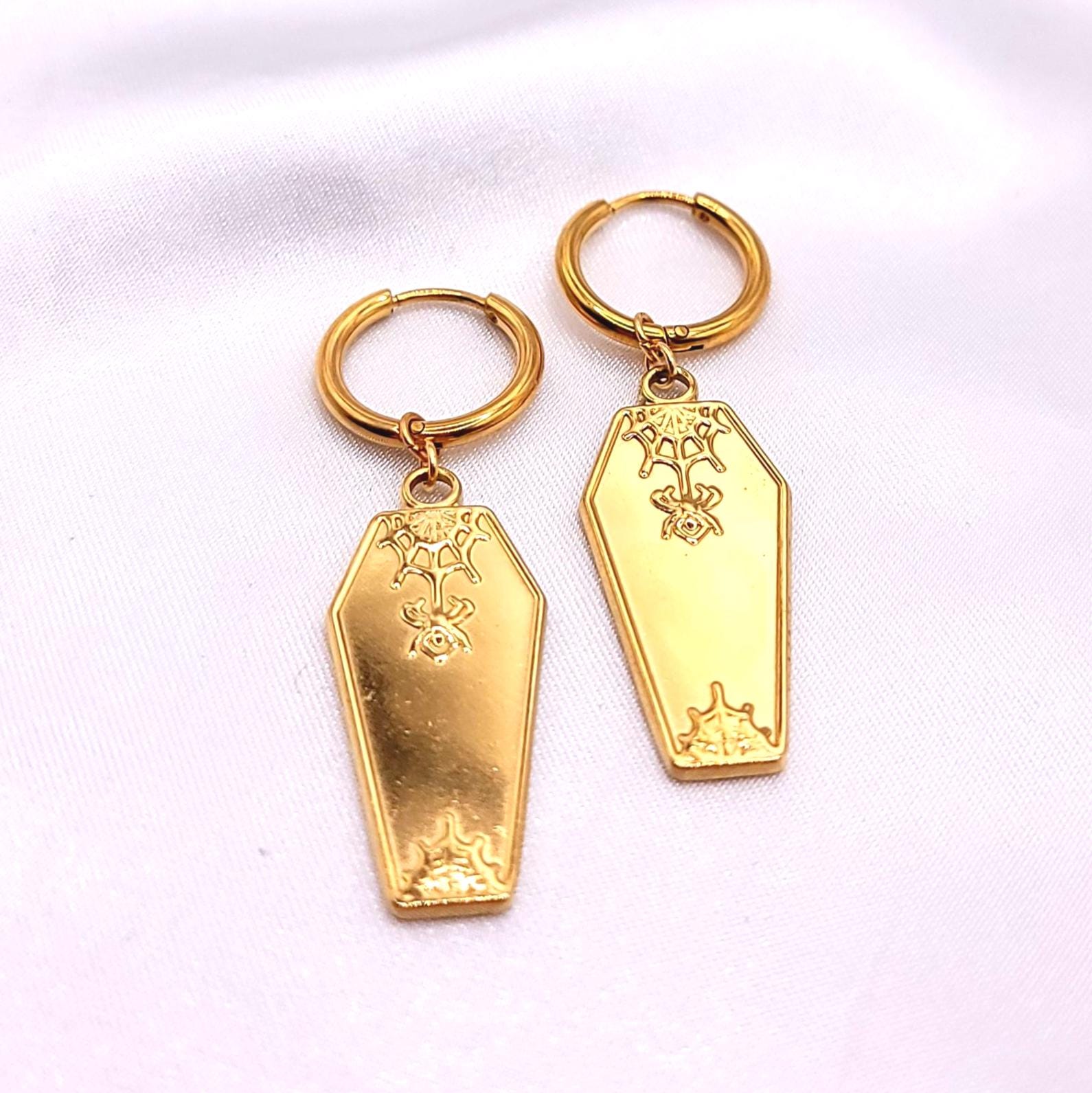 Stainless steel coffins hand from stainless steel hoops. The coffin piece measures about 1.25 inches long with the entire earring coming in just under 2 inches long.