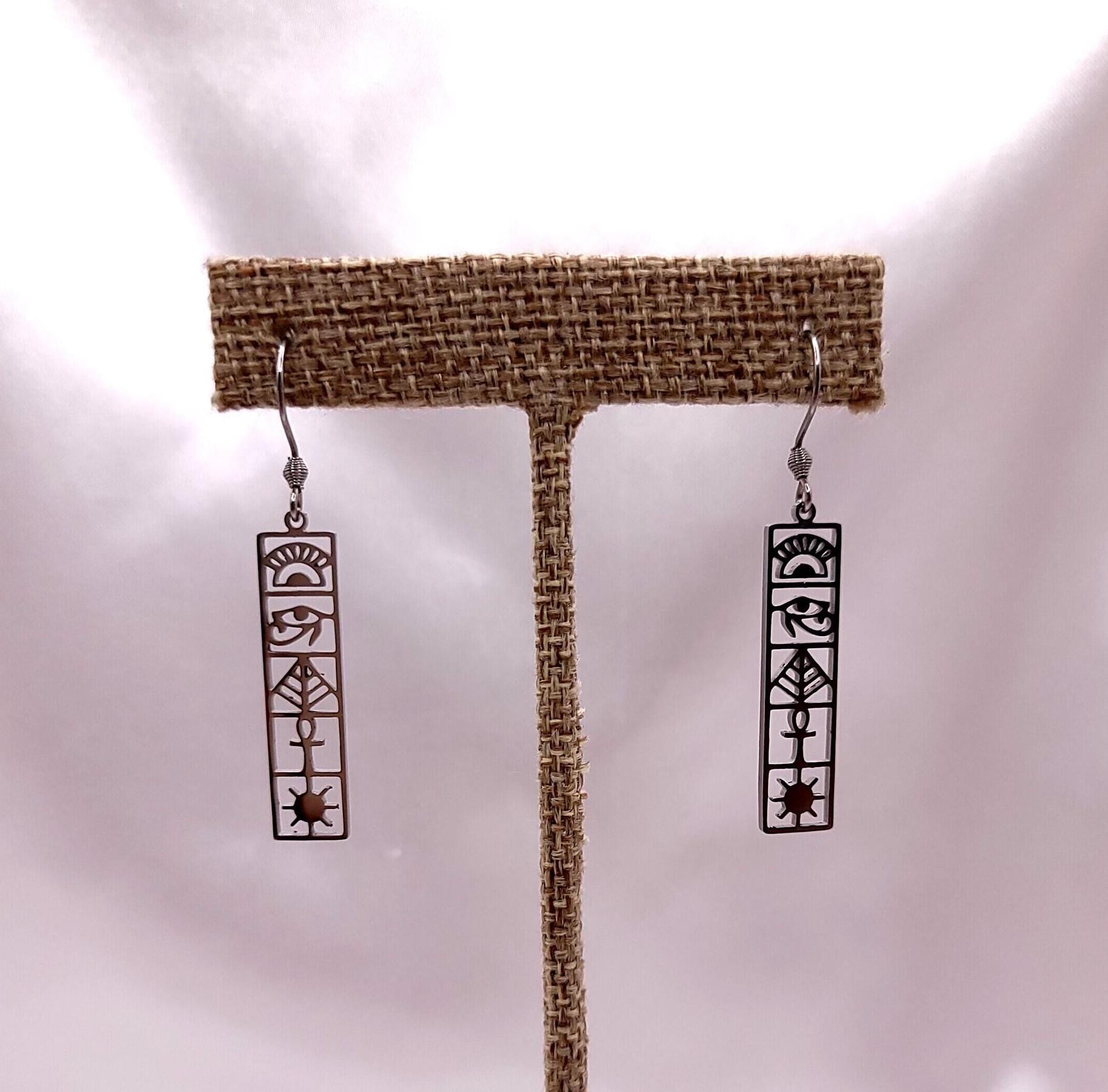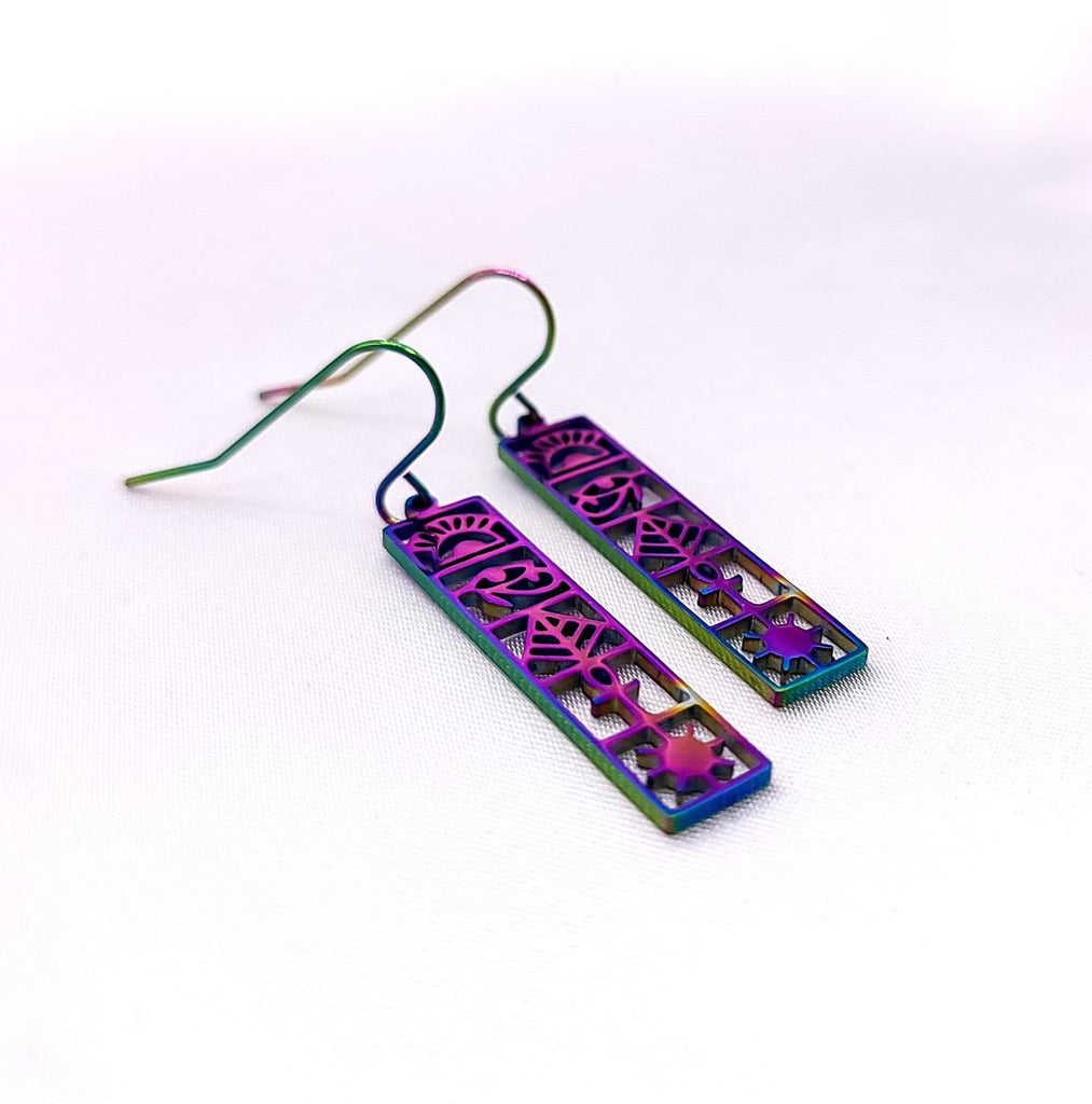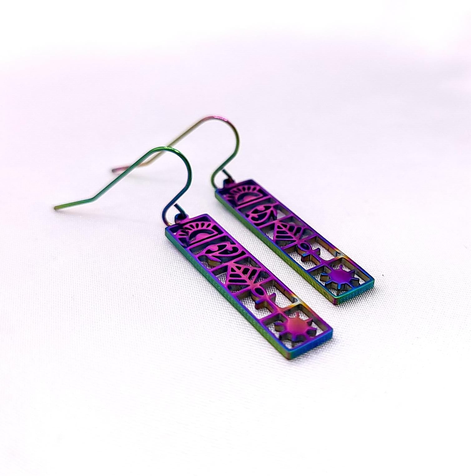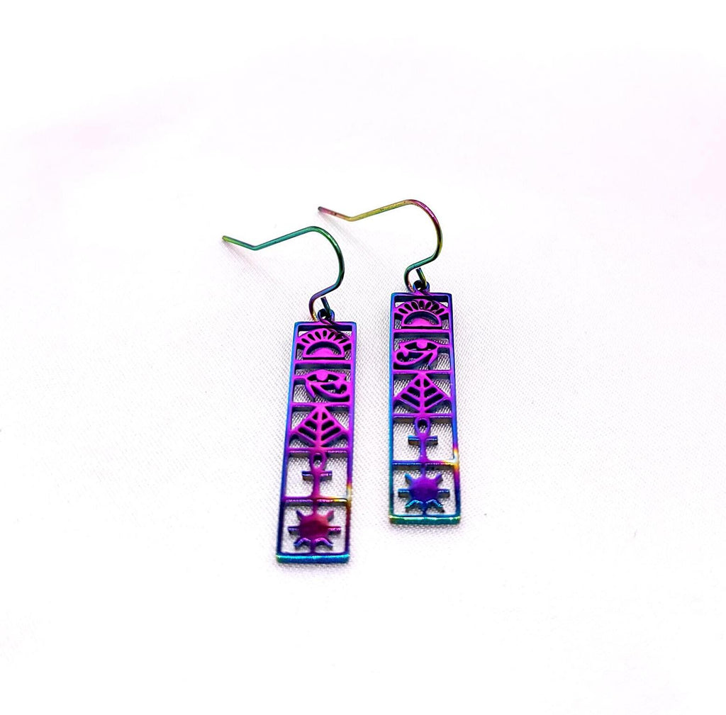 The hieroglyph charm makes me think of a tablet or cartouche. It is laser cut from stainless steel and measures about 1.25 inches long. Please message about clip-on options! Choose from polished silvery steel, 18k plated gold, and electroplated rainbow. Note that the rainbow variation may change slightly from each manufacturing batch.