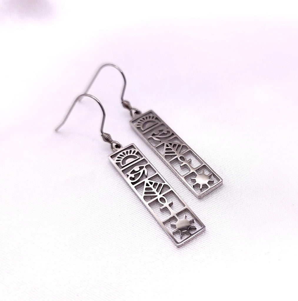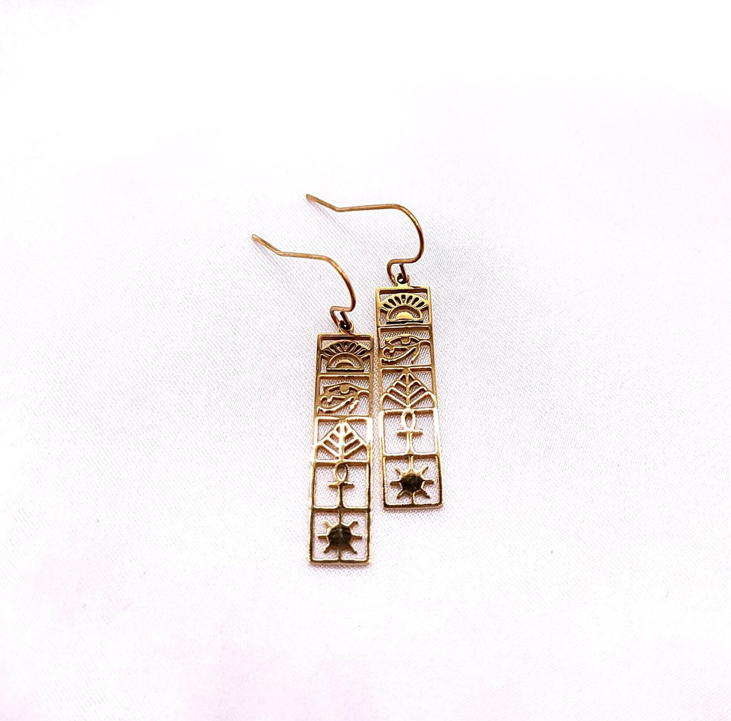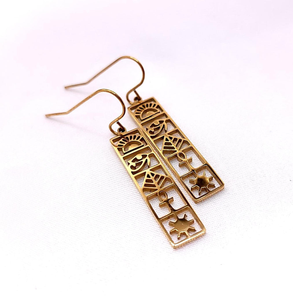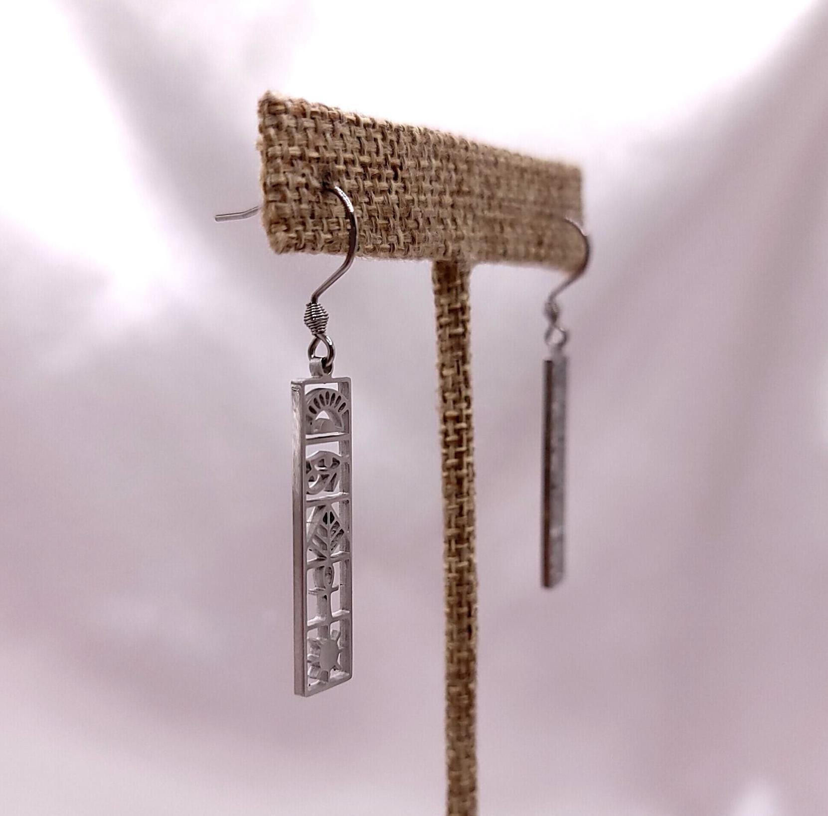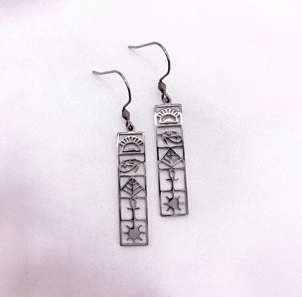 The hieroglyph charm makes me think of a tablet or cartouche. It is laser cut from stainless steel and measures about 1.25 inches long. Please message about clip-on options! Choose from polished silvery steel, 18k plated gold, and electroplated rainbow. Note that the rainbow variation may change slightly from each manufacturing batch.