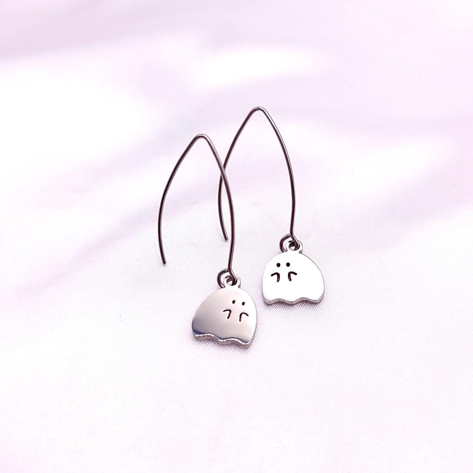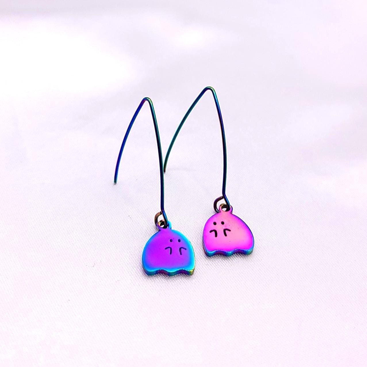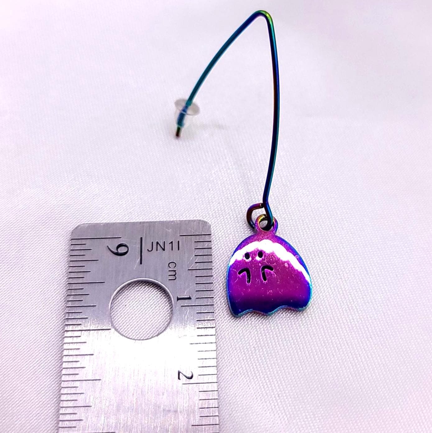 The ghost charm is laser cut from stainless steel and measures about 13mm long. The entire earring is about 1.6 inches long. Please message about clip-on options! Choose from polished silvery steel, 18k plated gold, and electroplated rainbow. Note that the rainbow variation may change slightly from each manufacturing batch.