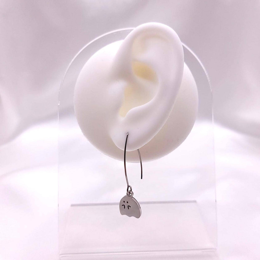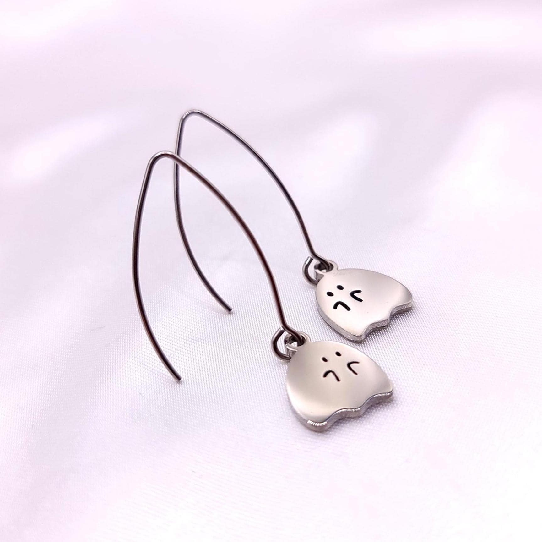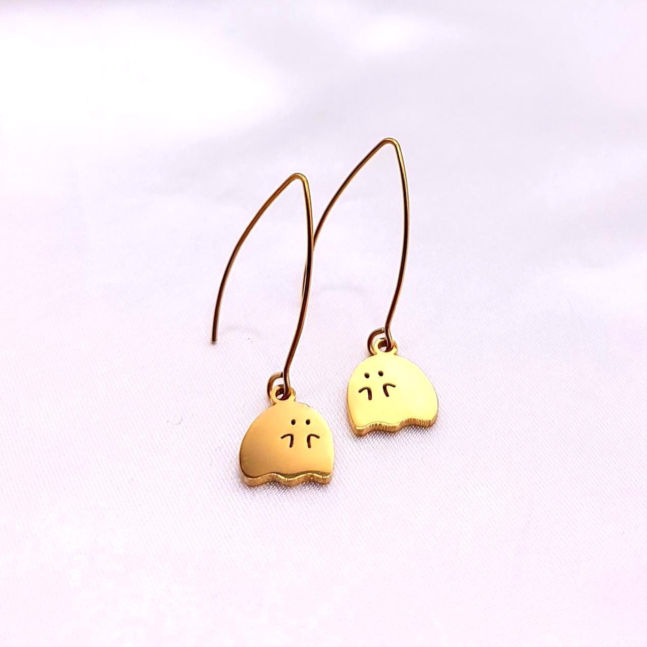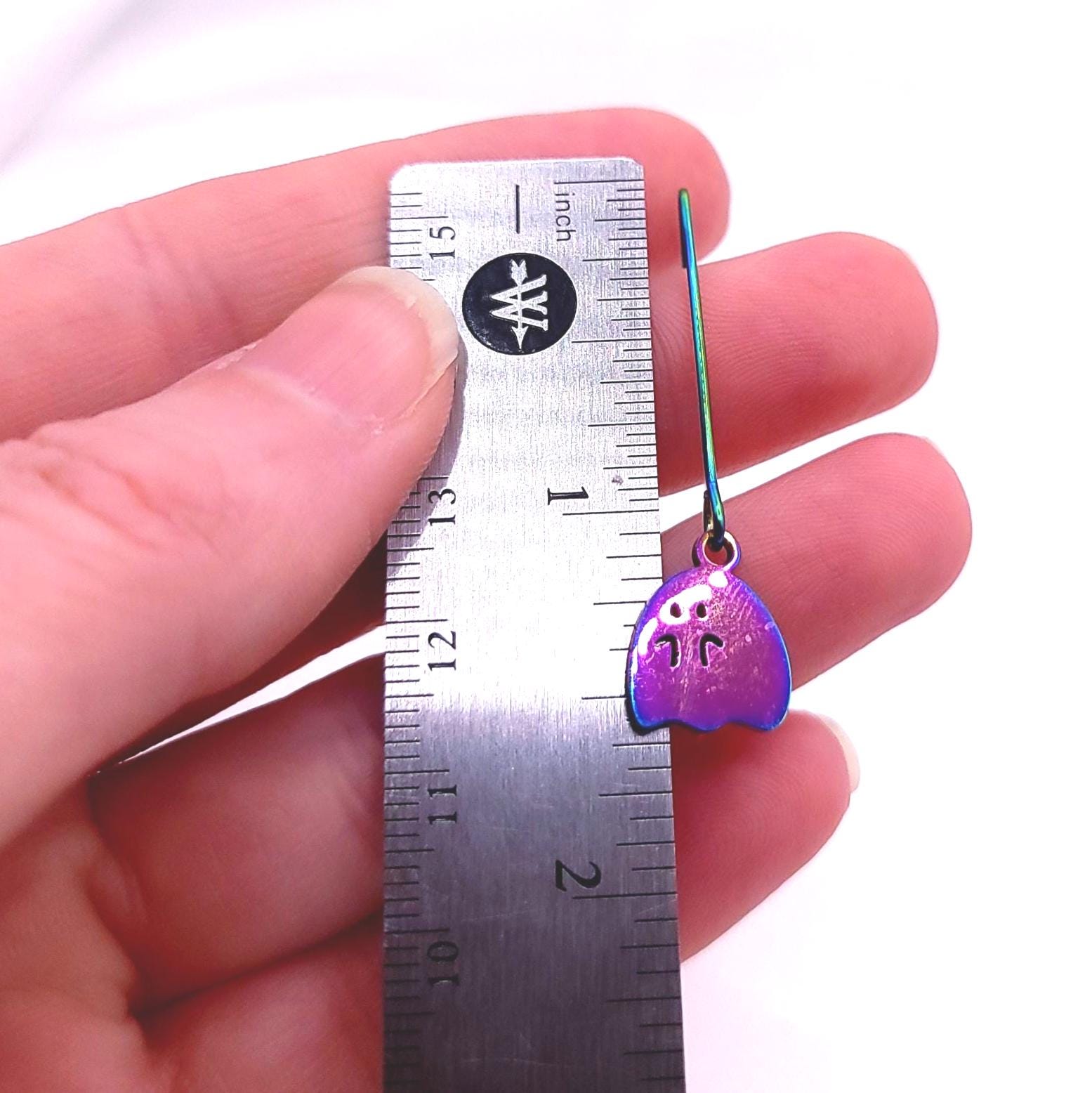 The ghost charm is laser cut from stainless steel and measures about 13mm long. The entire earring is about 1.6 inches long. Please message about clip-on options! Choose from polished silvery steel, 18k plated gold, and electroplated rainbow. Note that the rainbow variation may change slightly from each manufacturing batch.