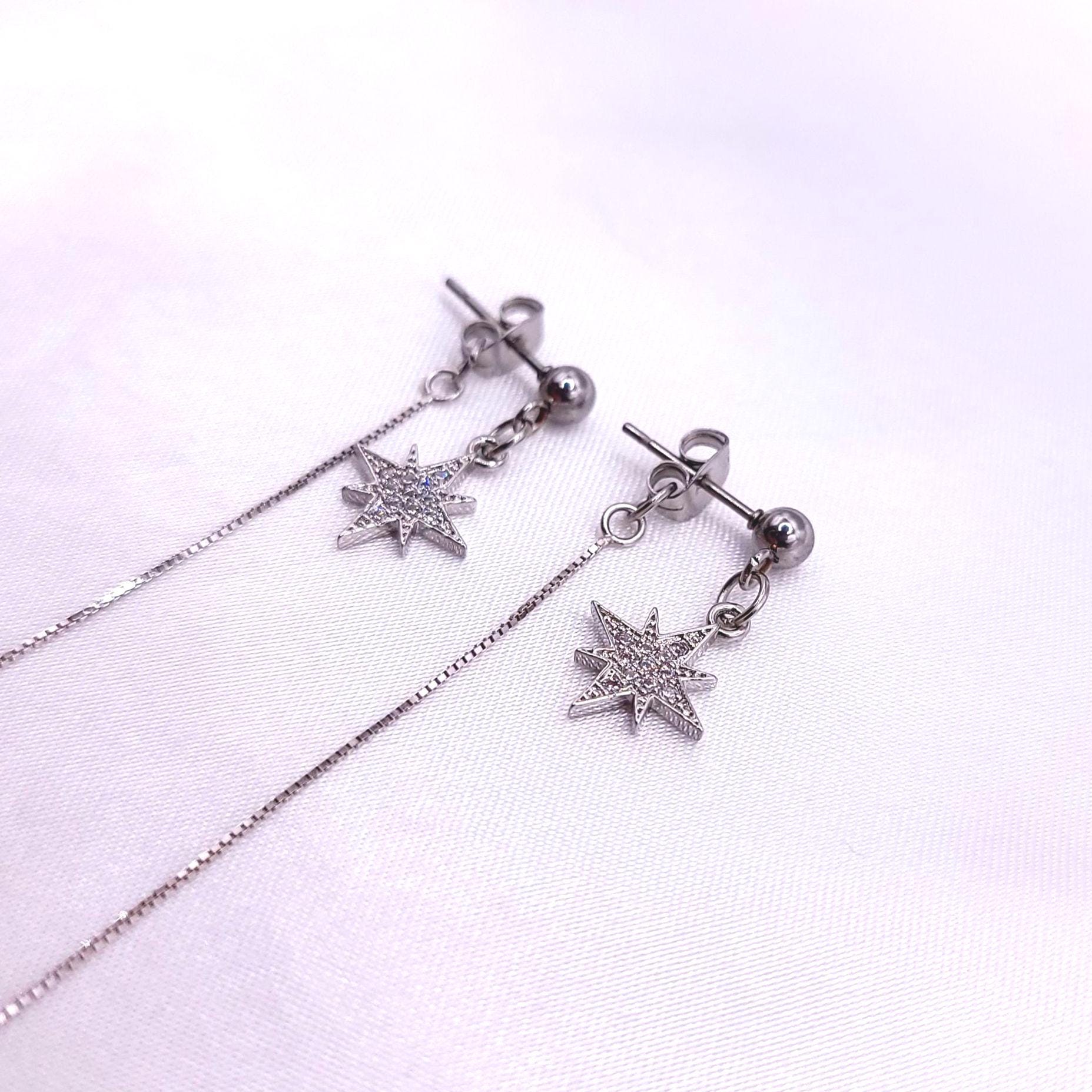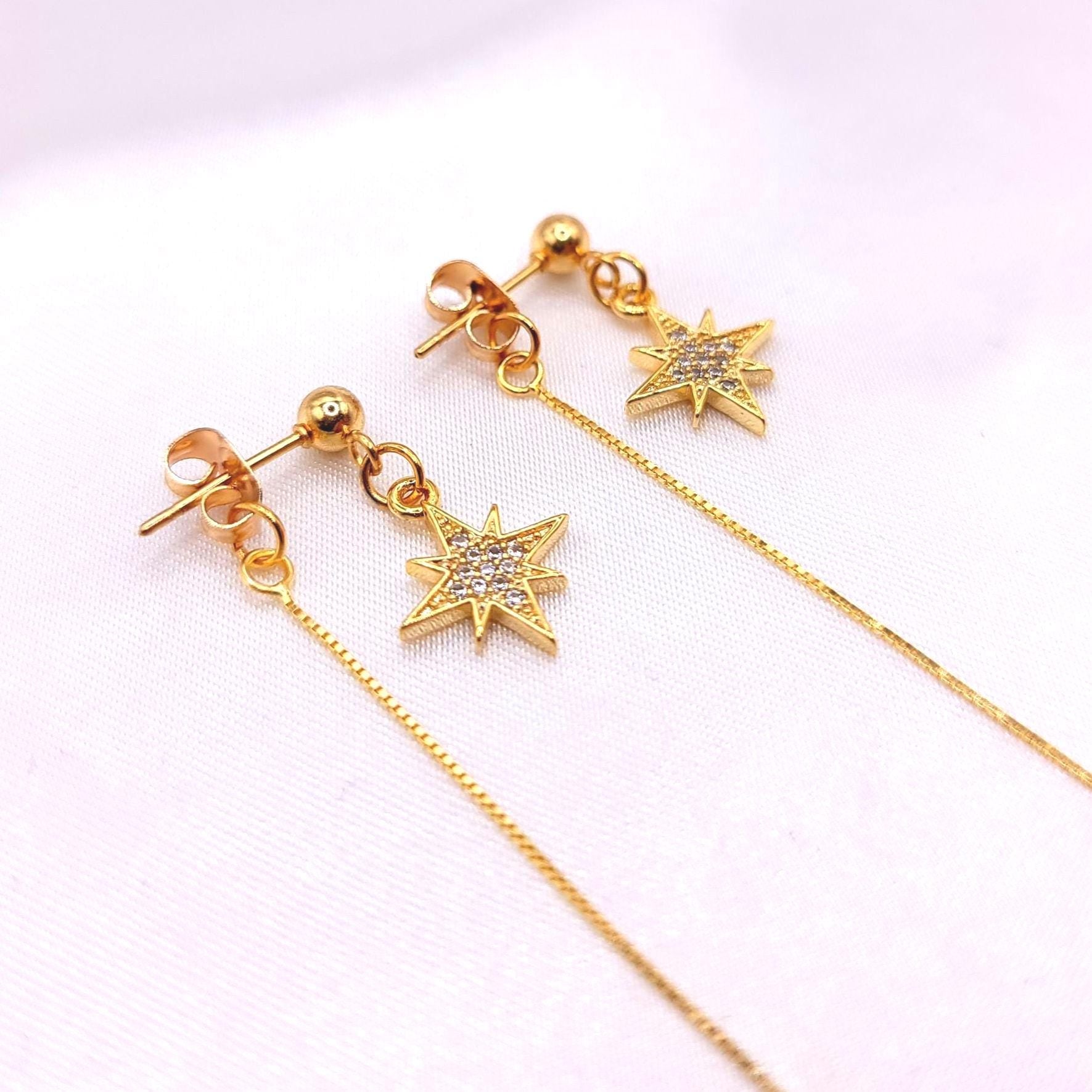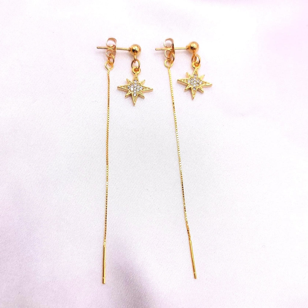 What a beautiful way to wear a threader earring, without wearing a threader earring! Post is stainless steel, chain is sterling silver, and charms are platinum or 18k gold plated brass. The front piece measures about 3/4 inches long and back piece measures just over 3 inches long.