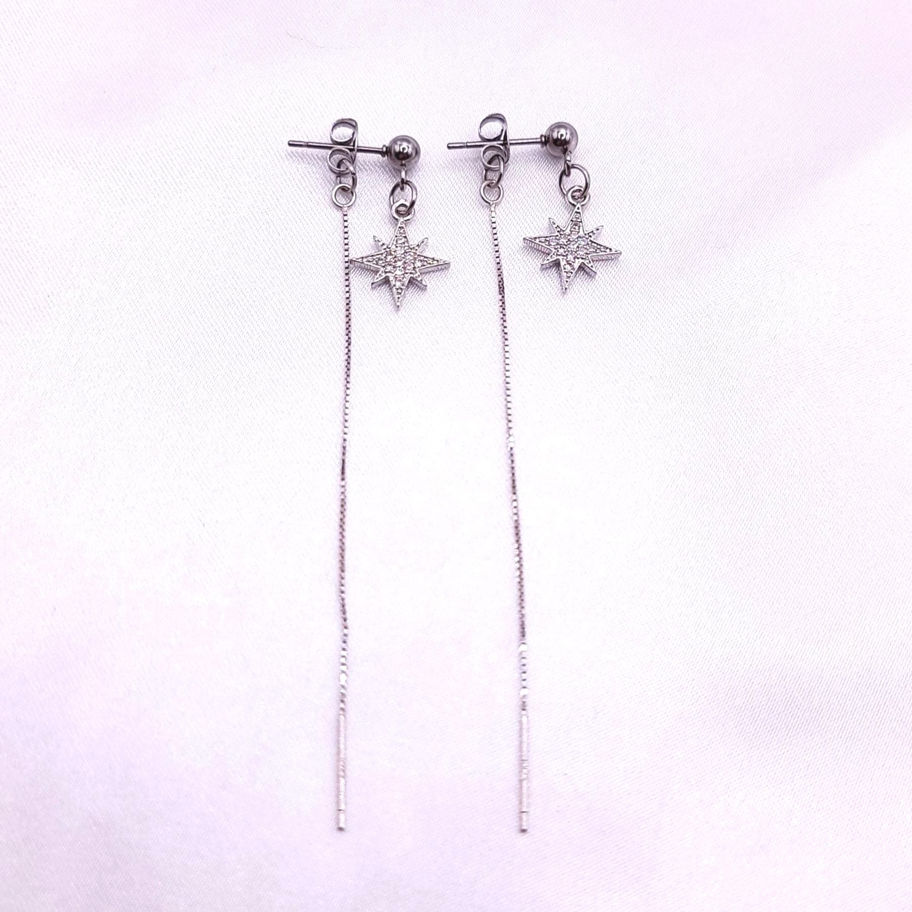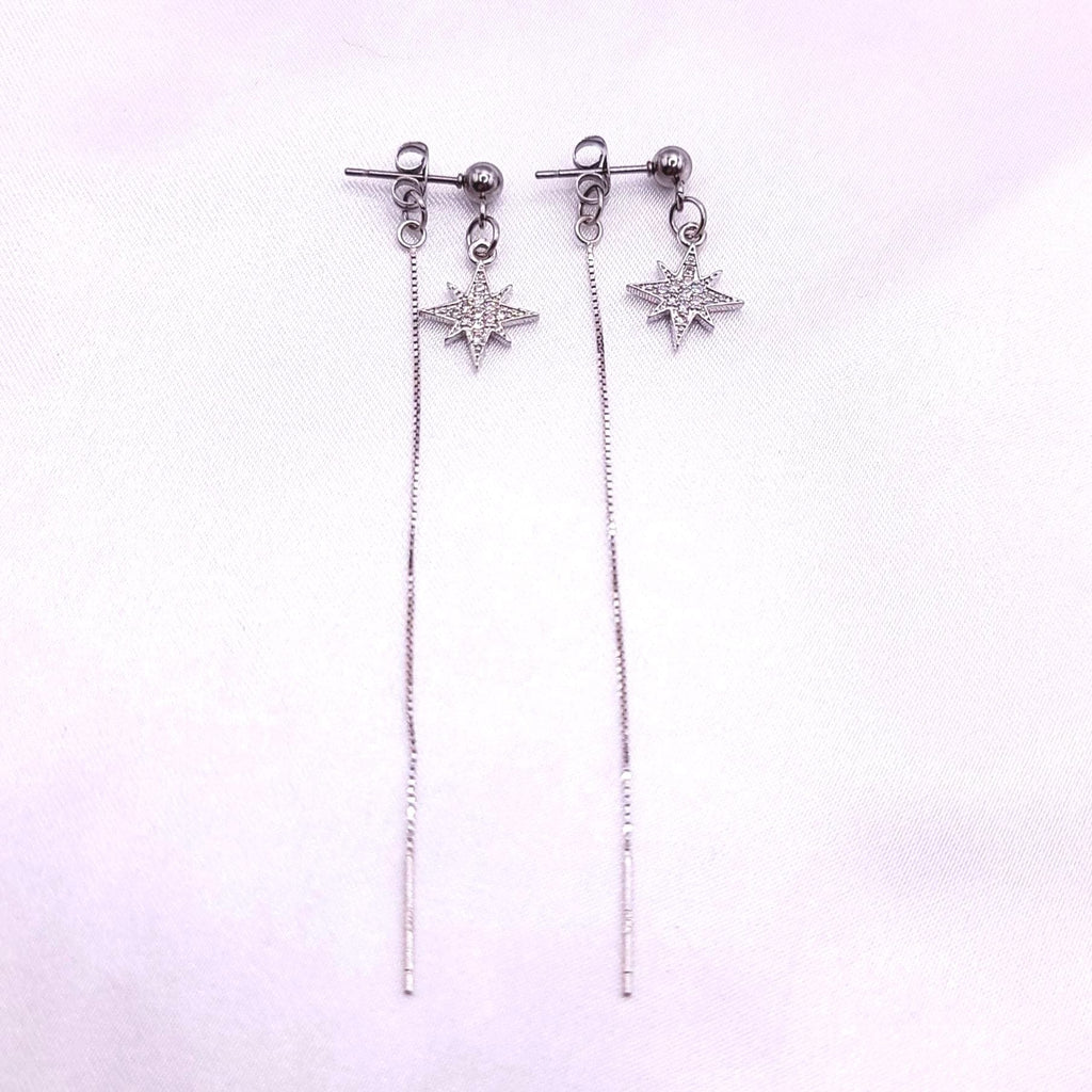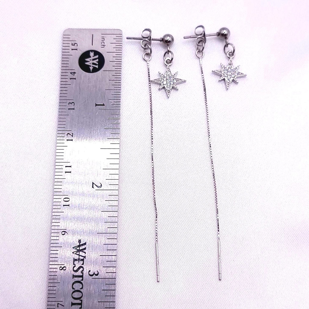 What a beautiful way to wear a threader earring, without wearing a threader earring! Post is stainless steel, chain is sterling silver, and charms are platinum or 18k gold plated brass. The front piece measures about 3/4 inches long and back piece measures just over 3 inches long.