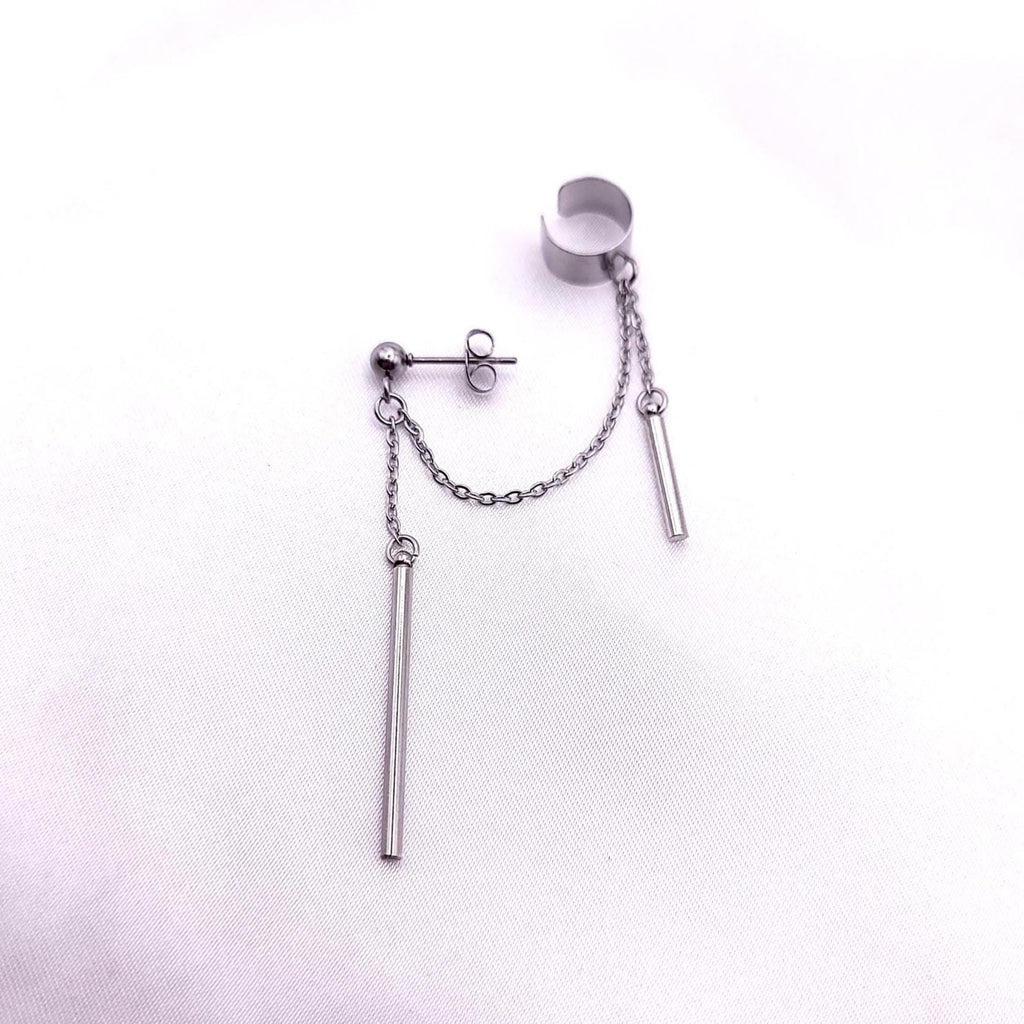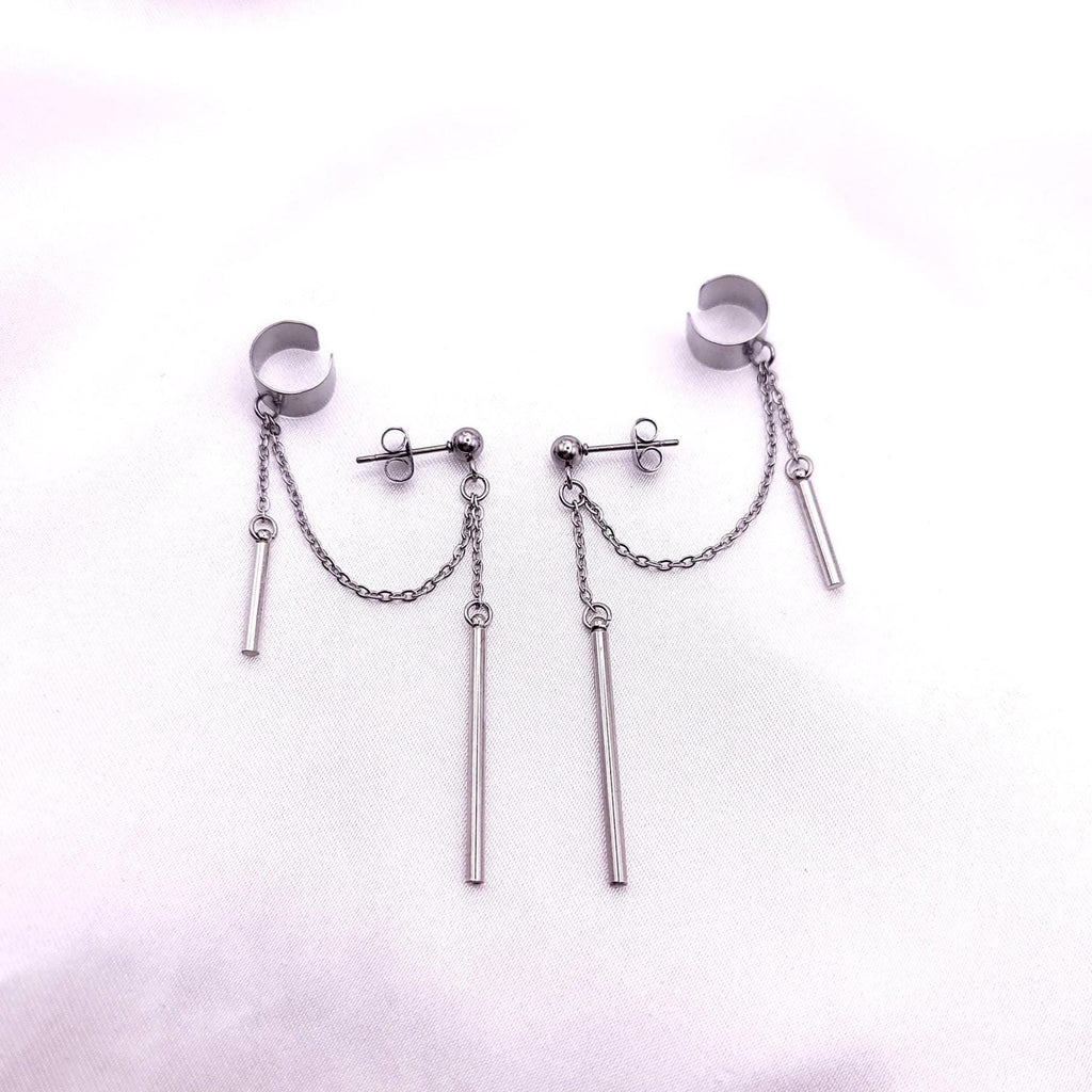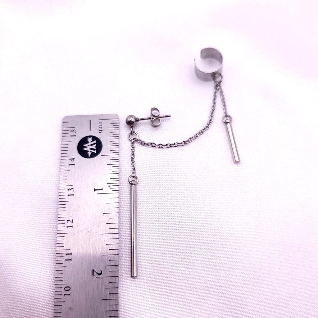 The earring is actually quite light and measures about 2 inches long. The chain from the post to the cuff measures just over 1.75 inches. We use stainless steel posts, cuffs and chains.